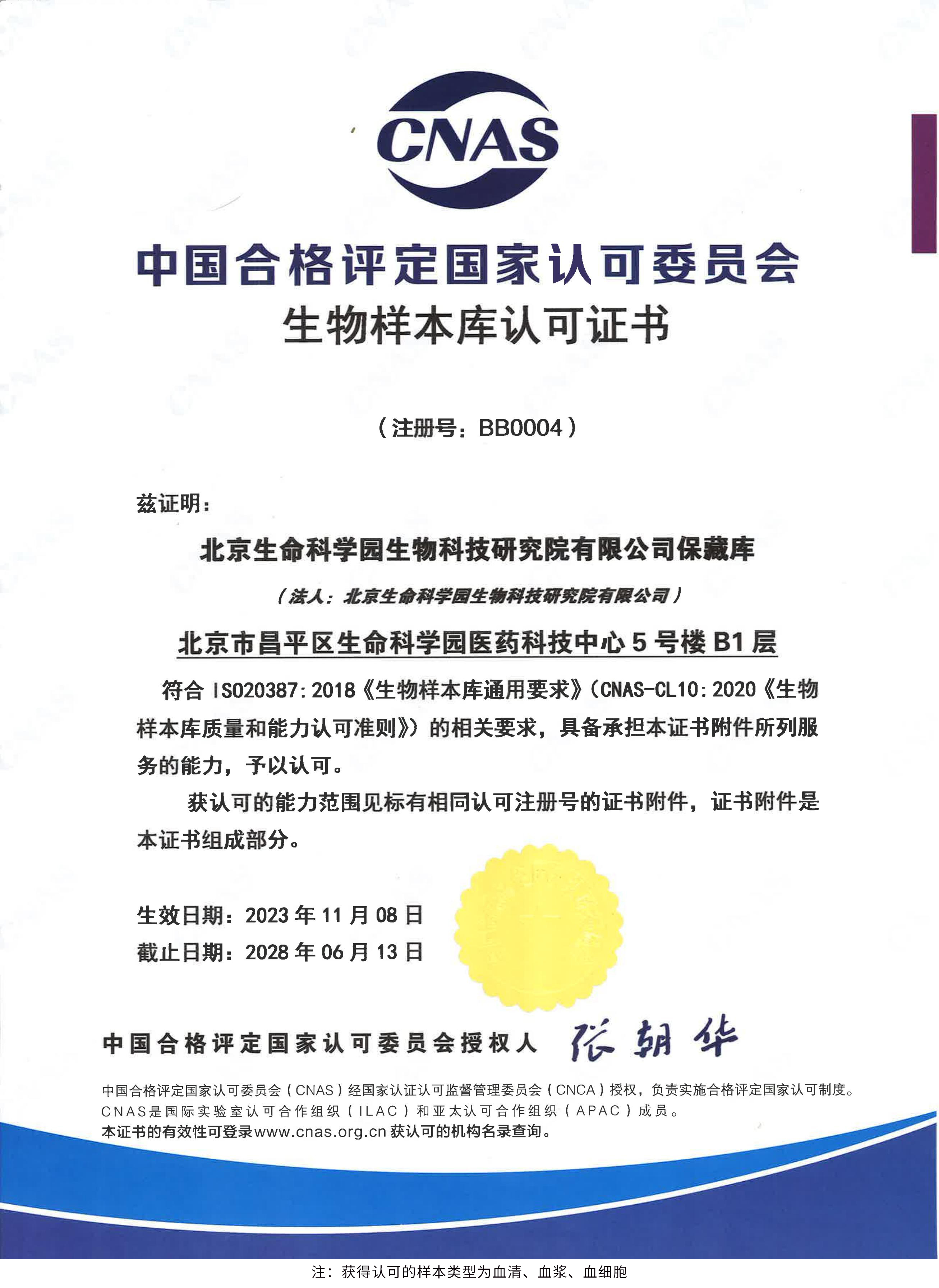 北京生命科學(xué)園生物科技研究院(以下簡稱“北京生物樣本資源庫”)(Biobank of Life Science Park,簡寫“BoLSP”)是一家由北京市科委和中關(guān)村生命科學(xué)園共同支持設(shè)立的第三方生物樣本庫公共服務(wù)平臺,秉承北京重大疾病臨床數(shù)據(jù)和樣本資源庫(以下簡稱“北京庫”)(Beijing Biobank of Clinical Resources,BBCR)十余年的發(fā)展成果,聚合眾多臨床樣本專家的專業(yè)共識,致力于在生命科學(xué)、生物醫(yī)藥研究領(lǐng)域發(fā)揮銜接樣本資源持有者與研究者的橋梁作用,解決生物樣本資源開發(fā)上下游信息不對稱、資源共享困難等問題。研究院在北京中關(guān)村生命科學(xué)園昌平園區(qū)建立了2000㎡生物樣本庫,最大存儲規(guī)模達(dá)1000萬份。研究院遵循CNAS-CL10:2020《生物樣本庫質(zhì)量和能力認(rèn)可準(zhǔn)則》,同時(shí)結(jié)合北京庫過去十年的工作經(jīng)驗(yàn)與教訓(xùn),建立了一套完善的生物樣本保藏質(zhì)量管理體系,從人、機(jī)、料、法、環(huán)、控多個(gè)角度,實(shí)現(xiàn)生物樣本保藏過程的全面質(zhì)量控制,先后獲得國家科技部頒發(fā)的人類遺傳資源保藏行政許可證書和中國合格評定國家認(rèn)可委員會(China National Accreditation Service for Conformity Assessment,CNAS)頒發(fā)的“CNAS認(rèn)可證書”。